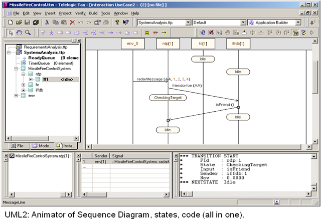 UML 2 gradually became a standard in 2003-2005. TeleLogic in Lund, Sweden, offered animation of UML2 Sequence Diagrams, states, and code, all in one partitioned window. Architects, testers, and devs could use a Sequence Diagram animator as an interactive tester GUI, among other things. A beta was available already a year or two before UML 2 took its final shape.