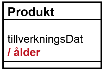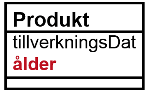 Anta som ett exempel att Produkt i vårt system har ett tillverkningsdatum och en ålder (ålder= maskindatum och tid minus tillverkningsdatum och tid). Tillverkningsdatum uppdateras aldrig i normalfallet, och blir ett attribut, men ålder ”beror på”: om den mäts i t ex månader så blir andelen uppdateringar mycket låg, vilket talar även för ålder som attribut: